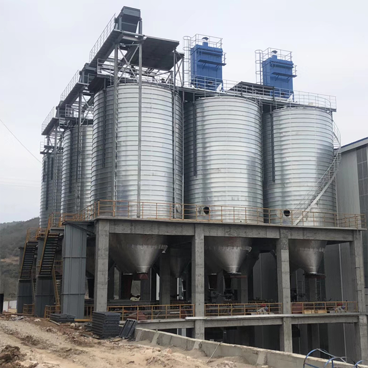 接收与清理设置在筒仓中央该形式筒仓一般采用对称排列,提升机井架固定,经过提升后的物料通过仓顶溜管进人筒仓。这种形式省去了仓顶输送设备和上通廊,从而节省了建造费用,缩短了建造工期。对于贮存时间要求较长的大型粮库,则应根据物料的流向、场地情况、工艺要求等合理地配置投料口、工作塔、烘干塔及榆林钢板仓的位置。国华钢板仓介绍了这几种常见的进料形式,实际中可将各种形式相互组合,相互渗透,根据实际情况合理搭配,灵活选用。